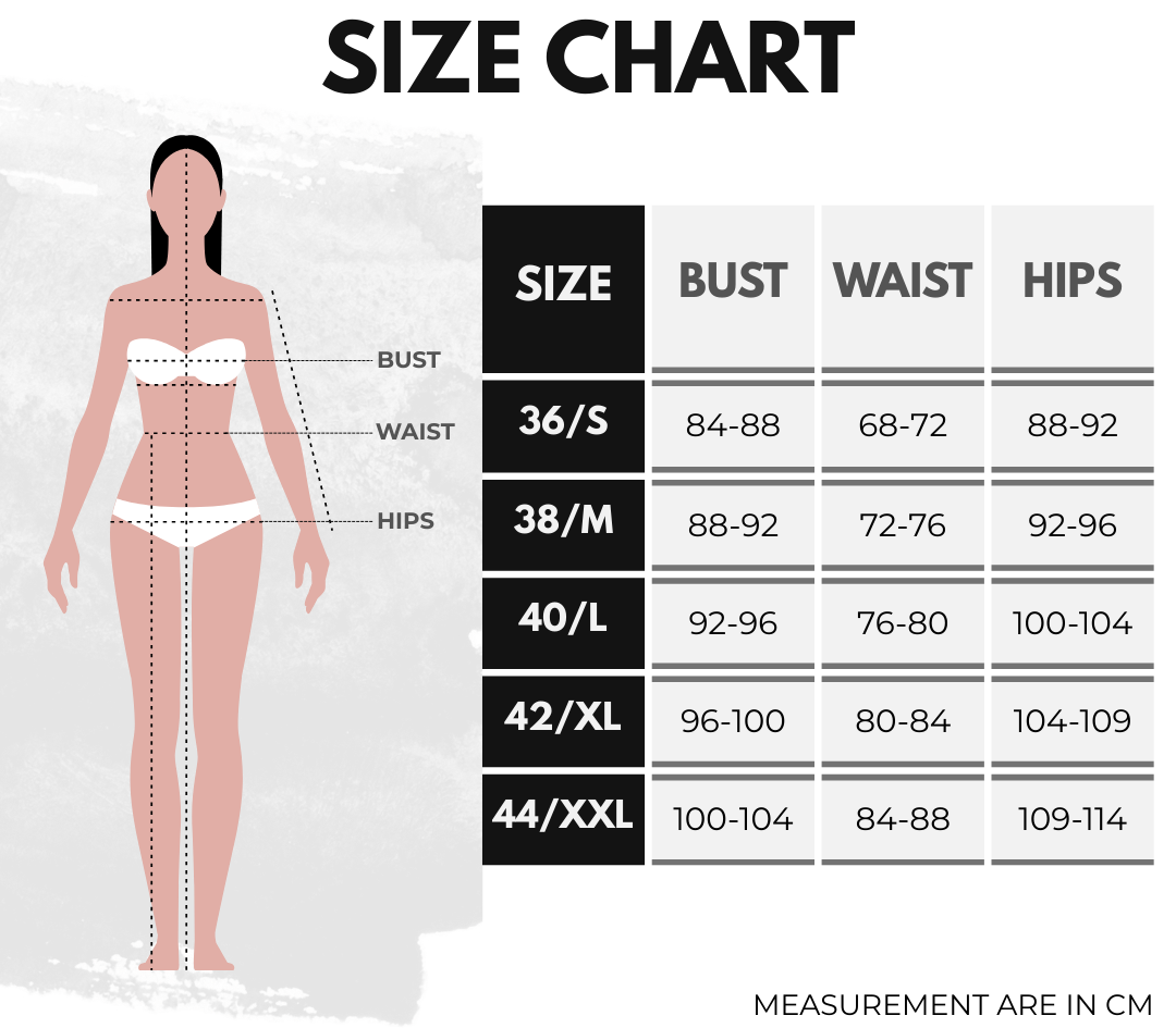 Model Measurements: Height: 173 cm, Weight: 53 kg, Bust: 83 cm, Waist: 64 cm, Hips: 92 cm. Model Size: 36/S.