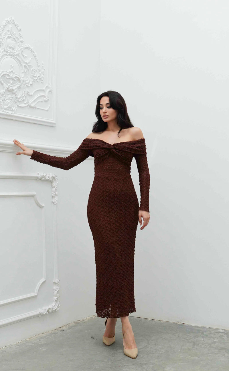 Features a strapless, horizontally draped cowl neckline and long, detachable sleeves detailed with decorative button closures. Constructed from satin fabric with a solid finish. Characterized by a corseted-waist effect and a fitted, midi-length silhouette. Fully lined interior. Fastens with a concealed back zipper closure.